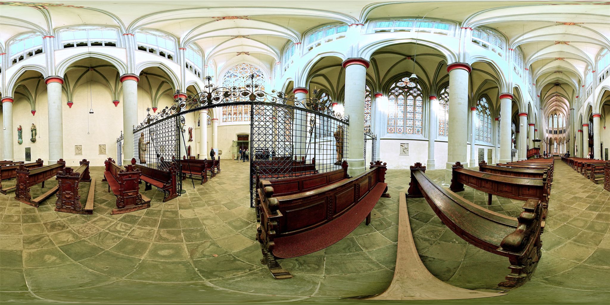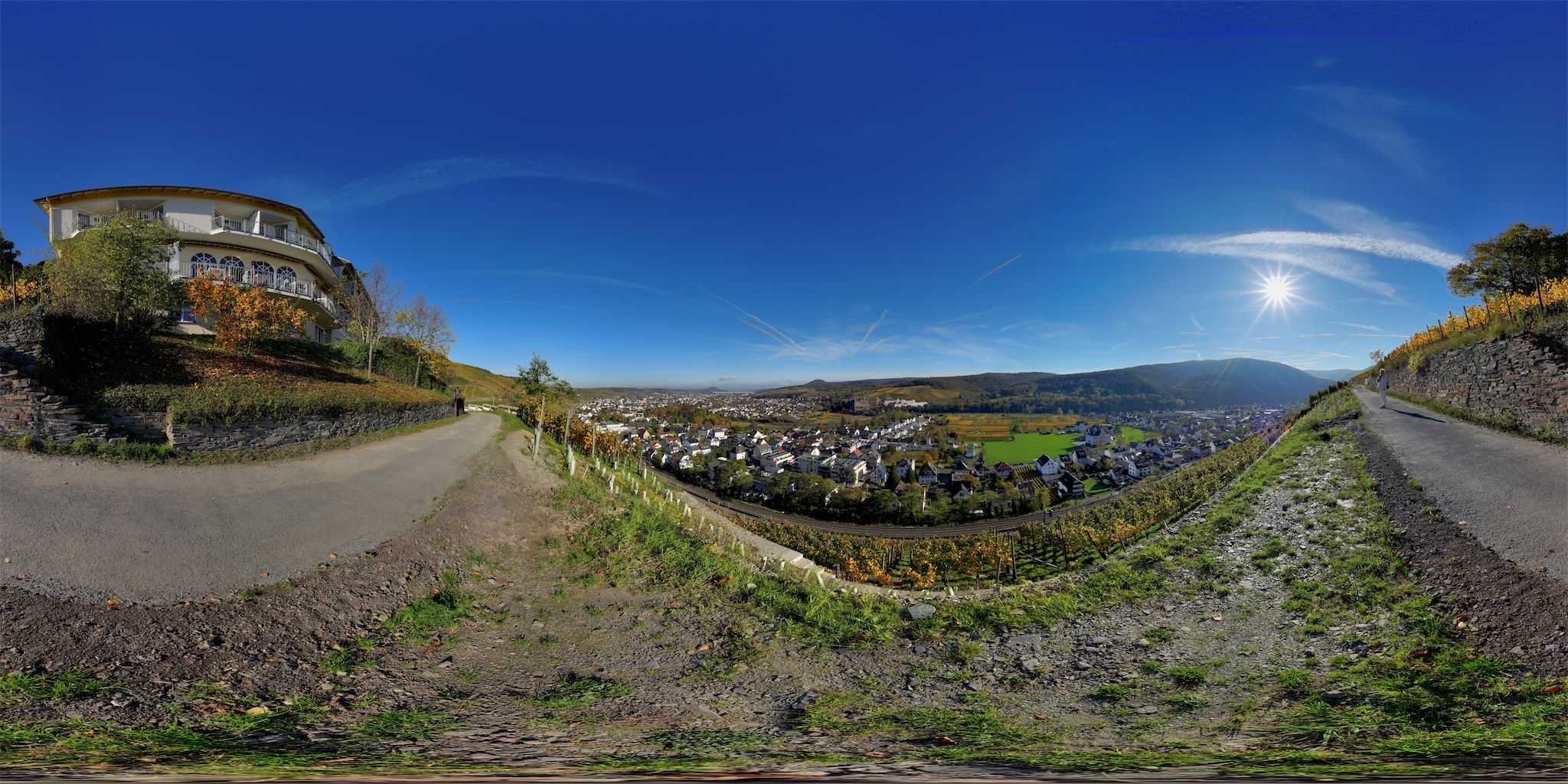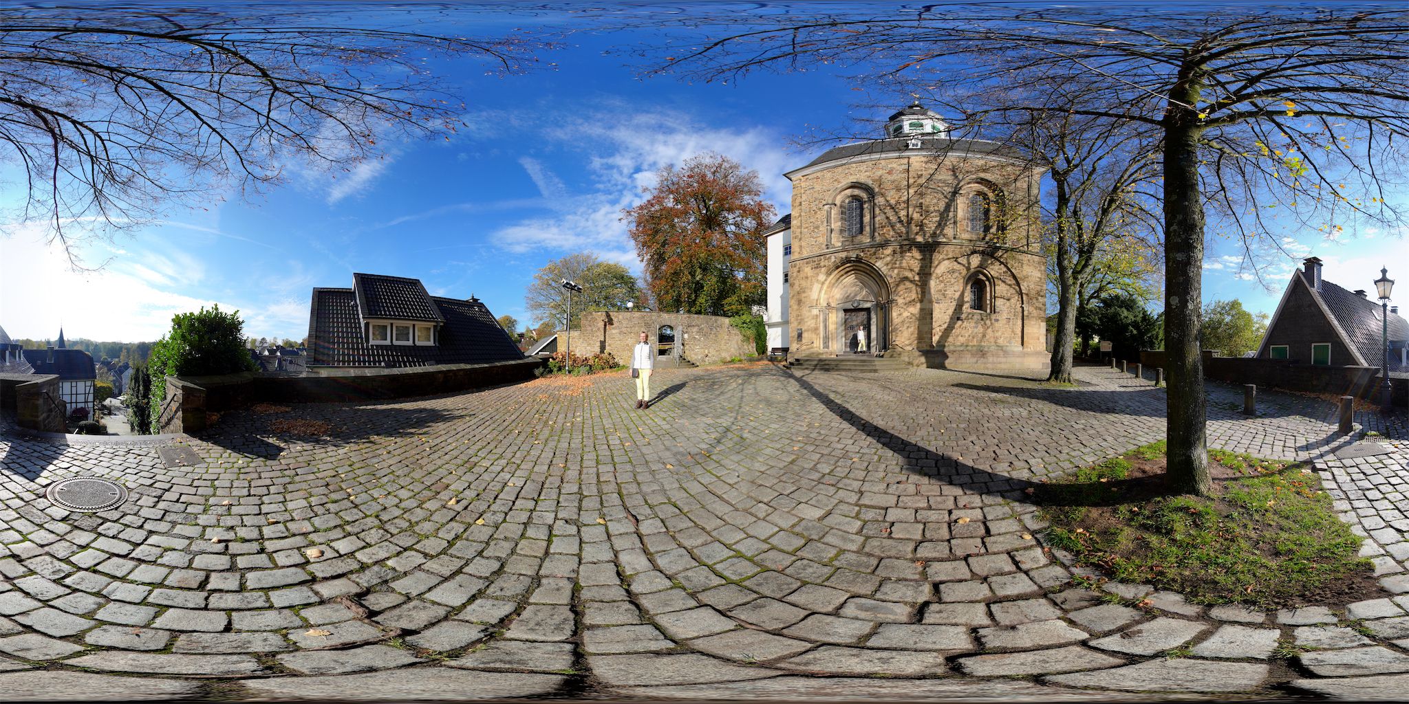 Verwendete Kamera: Sony A7CR (die ersten Panoramen mit Sony A7C), jeweils 4 Stativ-Aufnahmen (Monopod) im 90° Winkel mit Meike 7,5mm Fisheye + 1 Bodenbild Freihand. Es gibt u.a. mittlerweile Kameras die, bedingt durch ein vorderes und hinteres 180°-Objektiv, solch ein Panorama mit nur einer Aufnahme anfertigen können (One-Shot). Noch erreichen diese Kameras weder Auflösung (Schärfe) und Qualität gestichter Panoramen. Von Giga-Pixel-Panoramen ganz zu schweigen. Die Betonung liegt jedoch auf "noch"! Ob die Aufnahme von geschützten Motiven/Gebäuden mit meterlangen Sticks sich jedoch innerhalb der Panoramafreiheit bewegt, darf nach neuester Rechtsprechnung des BGH (betr. Drohnen) bei entsprechender Veröffentlichung in Frage gestellt werden. Auch bei diesen Kameras muß, wenn es relativ schön werden soll, immer zusätzlich ein Bodenbild erzeugt und eingefügt werden um den Fotografen bzw. das Stativ zu entfernen und um den Nadir qualitativ aufzuwerten. Und ein schöner Little-Planet-Start des Panoramas ist m.M.n. nur mit einem gut eingepassten und hochwertigen Bodenbild ansehnlich.