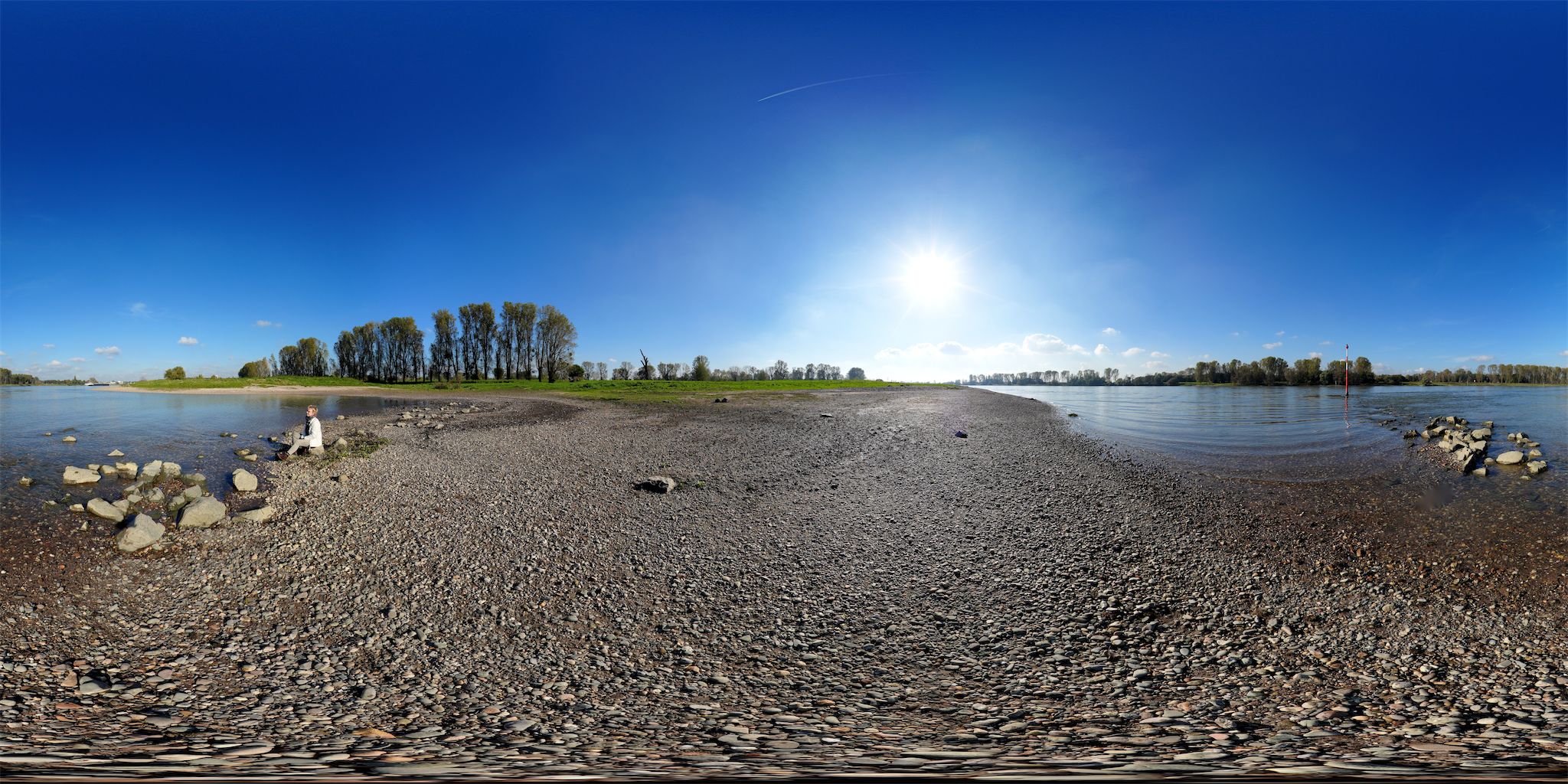 Anmerkung zur Aufnahme-Technik: Alle Panoramen sind bis jetzt mit einem Monopod/Einbein aufgenommen. Das hat den Vorteil, dass ich mit relativ wenig und leichtem Equipment unterwegs sein kann. Der Nachteil ist, dass man das Einbein sehr genau in der Waage ausrichten muß, da es sonst beim Stitching, sprich dem "zusammennähen" der Einzelbilder, durch Parallaxenfehler in den Einzelbildern zu schlechten Ergebnissen kommen kann. Und bitte nicht wackeln, sonst passen die Einzelbilder an den Nähten nicht korrekt zusammen. Insbesondere in den extremen Bereichen von Nadir und Zenit. Man muß also schon sehr genau bei der Aufnahme arbeiten, wenn man sie nachher nicht für unbrauchbar erklären möchte, oder den einen oder anderen irreparablen Fehler im Panorama akzeptieren, wenn man "leicht" unterwegs sein will.